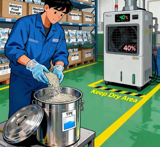 Како полимерен материјал, TPE суровините се многу чувствителни на влажноста на околината. Тие лесно ја апсорбираат влагата од воздухот за време на складирањето или транспортот, што доведува до деградирани својства на материјалот, тешкотии во обработката, па дури и до компромитиран квалитет на финалниот производ. Ефективното управување со влагата за TPE материјали бара повеќеслоен пристап кој опфаќа контрола на околината за складирање, оптимизирани методи на пакување и дополнителни заштитни мерки.